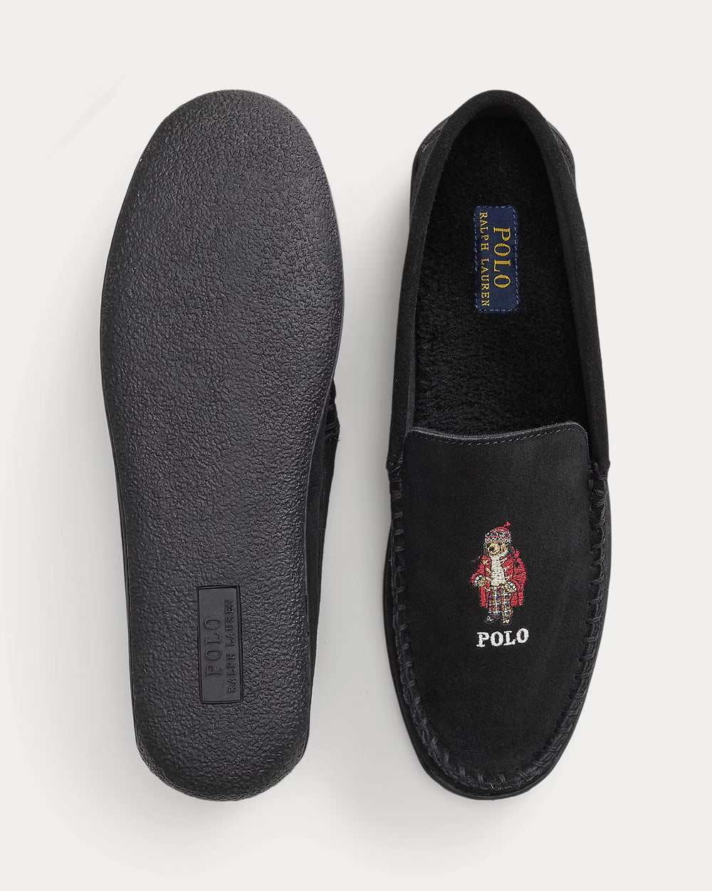 Dressed for the season in a duffel coat, plaid trousers and Fair Isle hat, the Polo Bear adds a festive touch to these suede slippers. Designed with a plush faux shearling insole for comfort, they are finished with hand-stitching on the vamp.