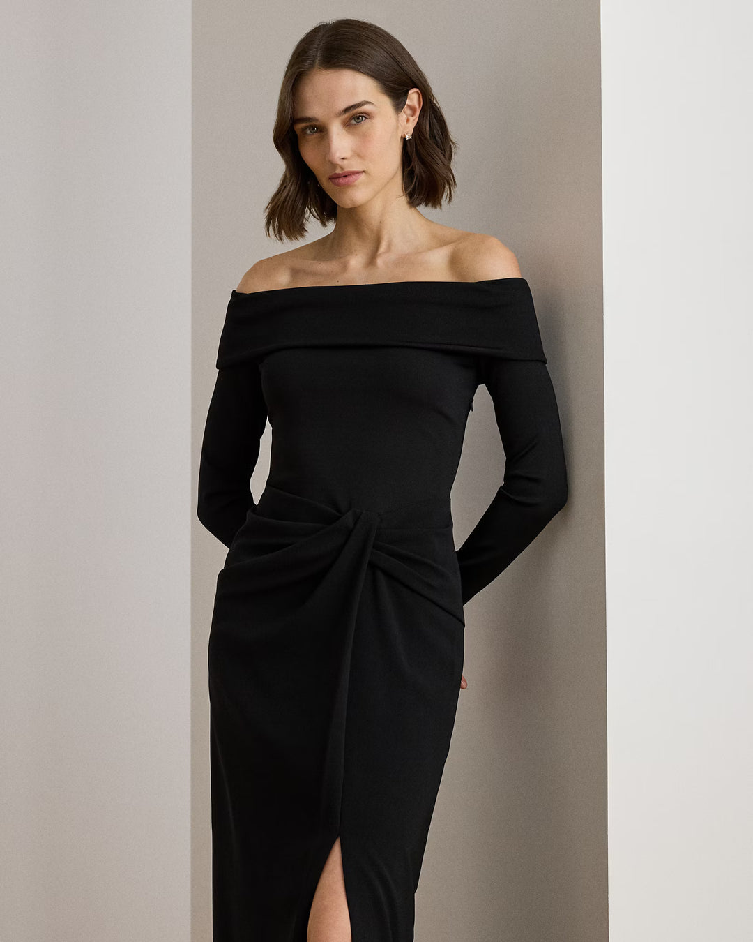 Fold-over off-the-shoulder silhouette. Concealed left side seam zip.