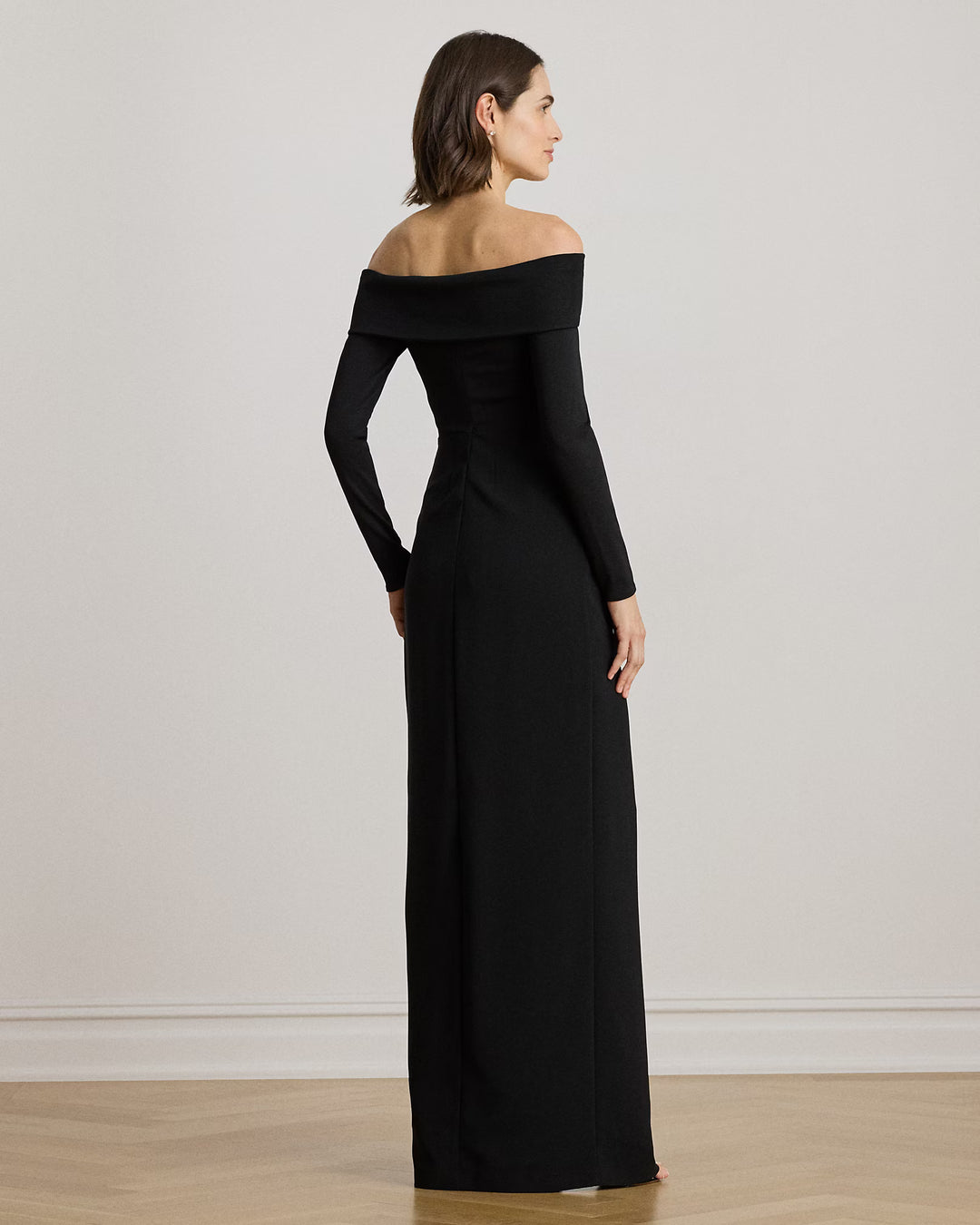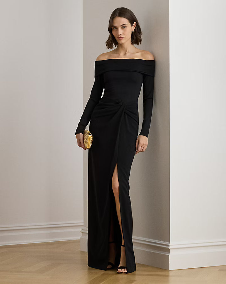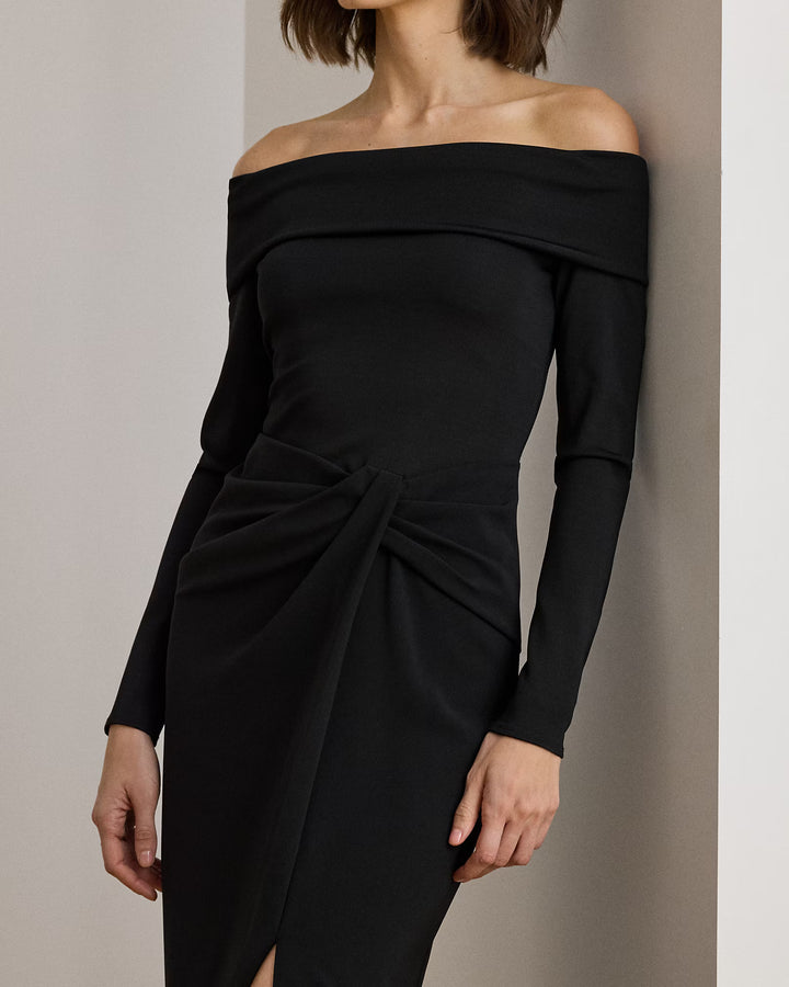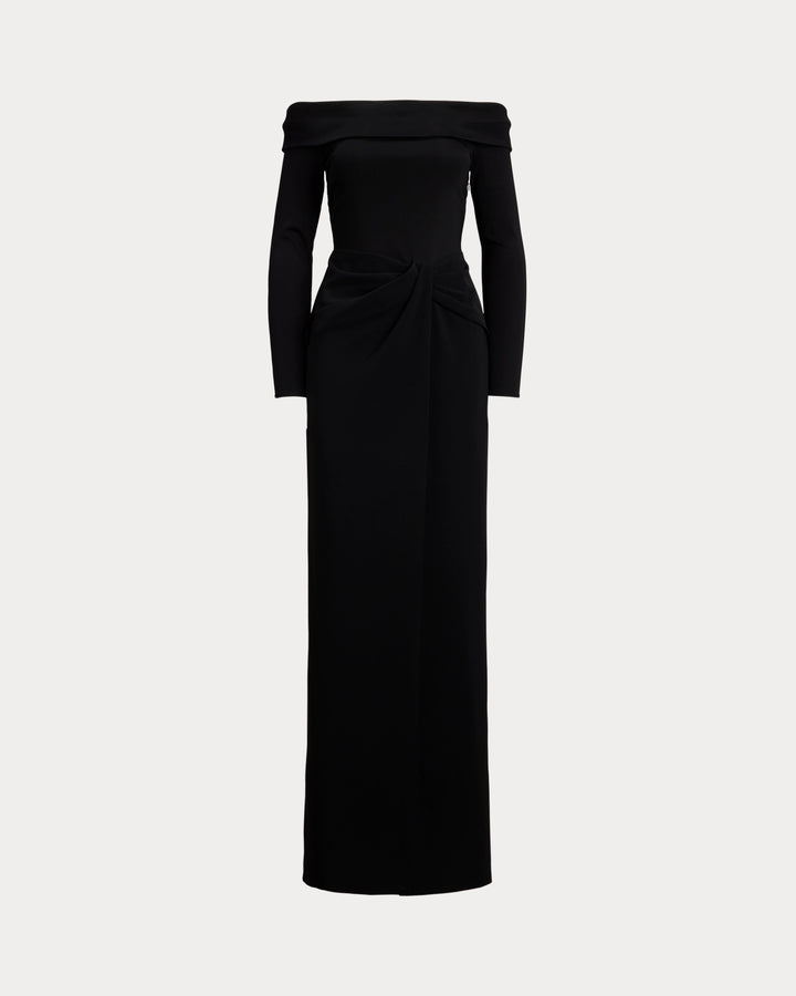 Timeless and elegant, this column gown combines a rib-knit off-the-shoulder bodice with a wrap-style crepe skirt.
