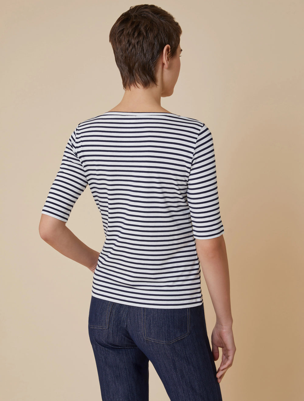Stretch viscose jersey T-shirt. The slim-fit model boasts a boat neckline and elbow-length sleeves.