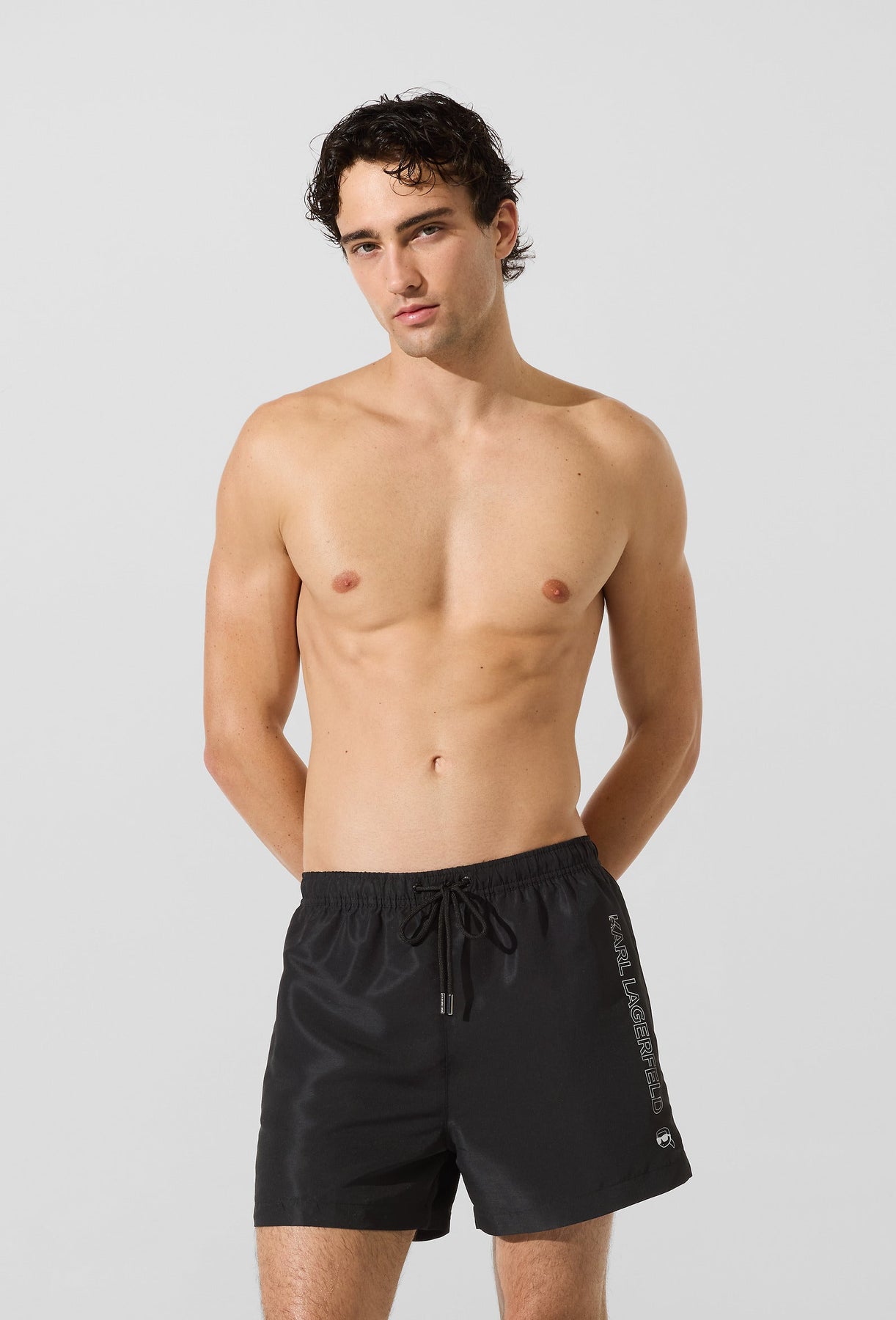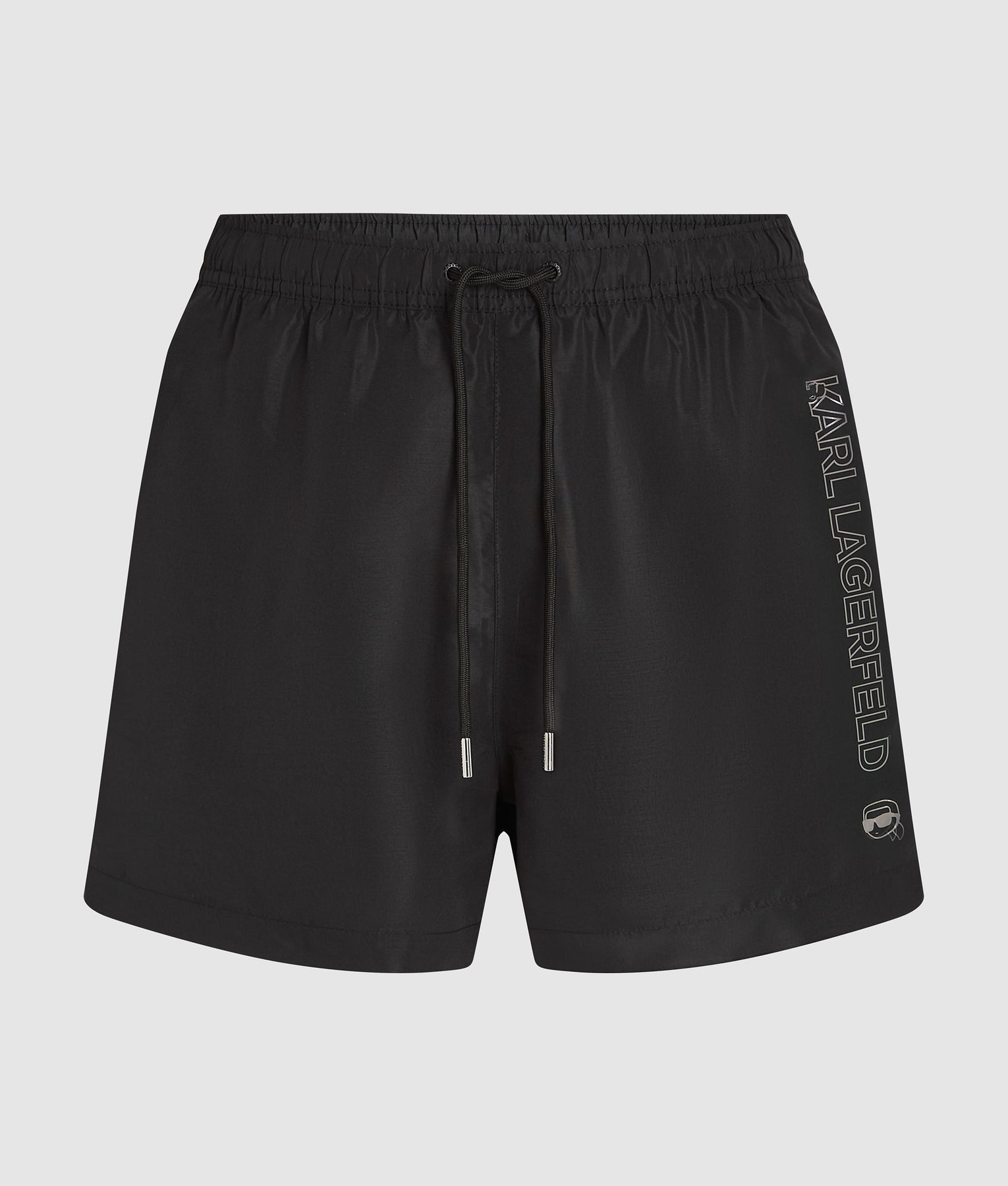A sleek silhouette with a subtle metallic sheen, these short-length boardshorts offer effortless wear and a secure fit thanks to their elastic waistband and adjustable drawcords.