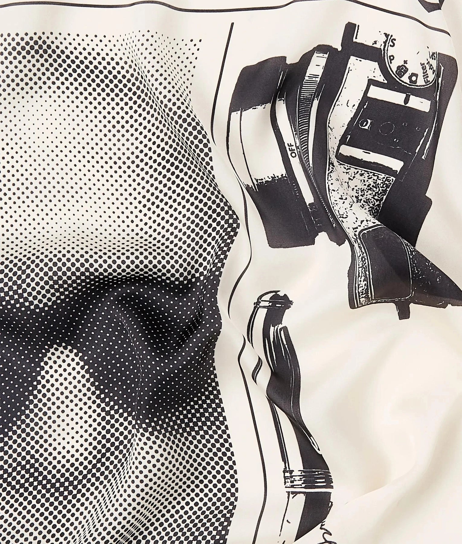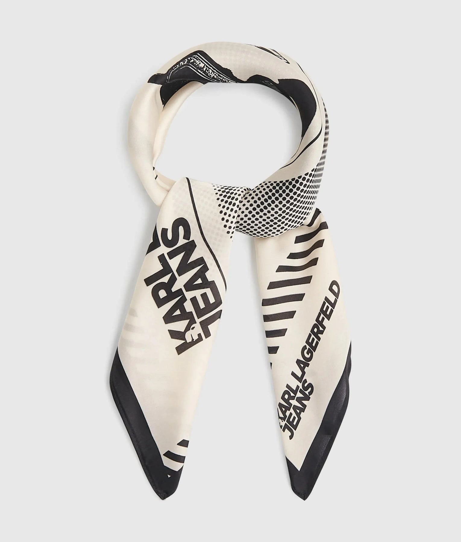 A bold square scarf featuring a graphic tribute to Karl Lagerfeld, designed with a slim border and versatile ties to express your unique style.