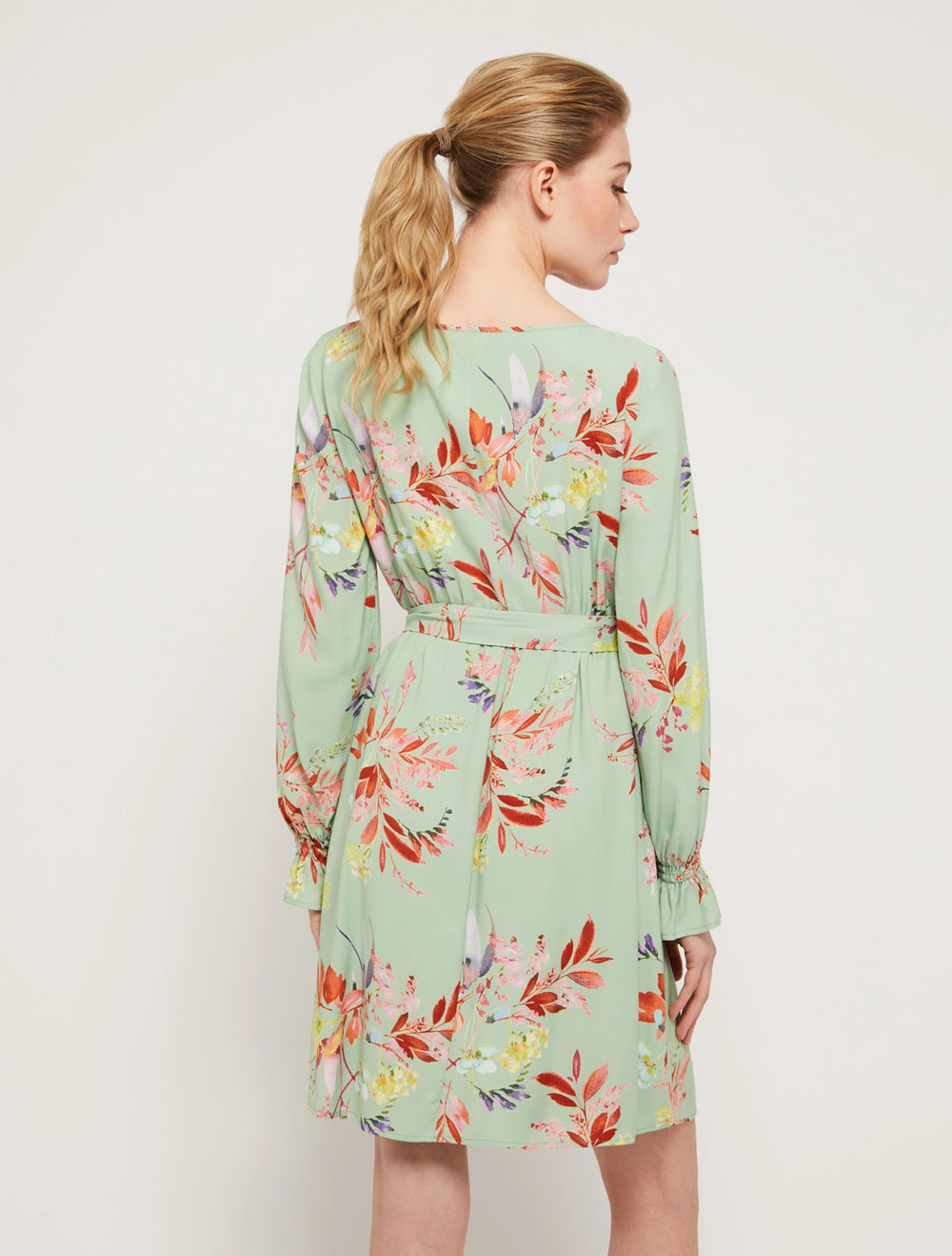 Boat-neck dress in printed viscose sable fabric featuring gathered cuff-embellished long sleeves and a darted waist. Garment-finishing and silhouette-accentuating matching-fabric belt. Side zip fastening. Length: 90 cm. Unlined model.