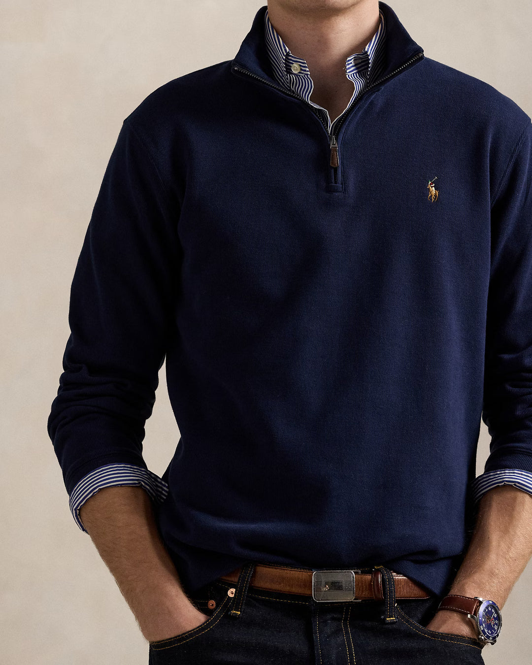 Mockneck. Quarter-zip placket. Zip pull custom-developed with a "Polo" logo.