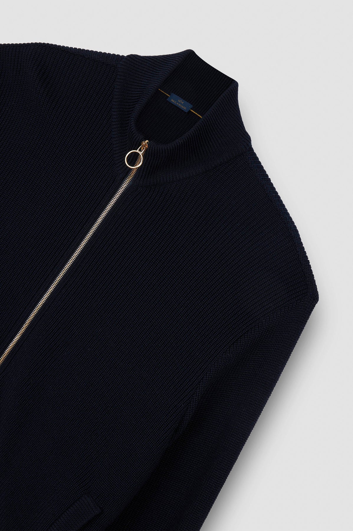 A stand-up collar in the form of a delicate ribbing, together with wide, elastic cuffs and hem, harmoniously complement the design, lending the cardigan a subtle, contemporary touch. The central gold-shine zipper with a designer, round puller is a bold and consistent detail that enlivens this classic piece.