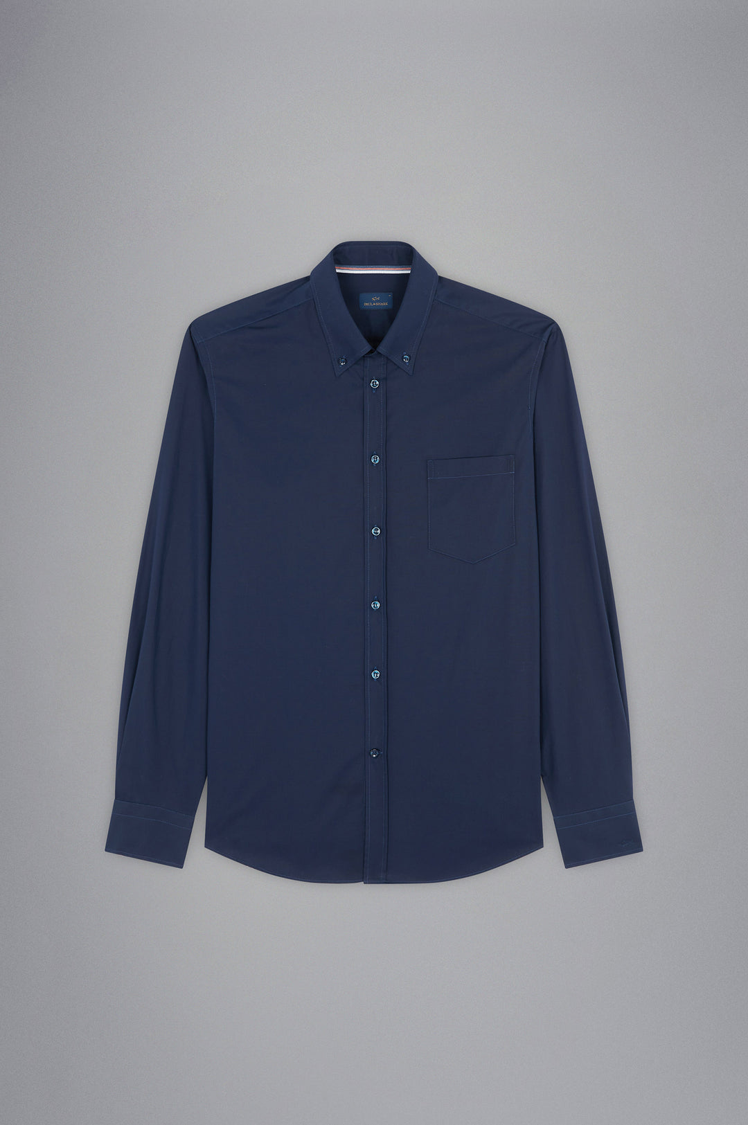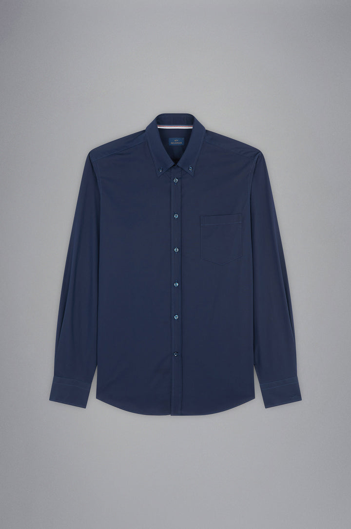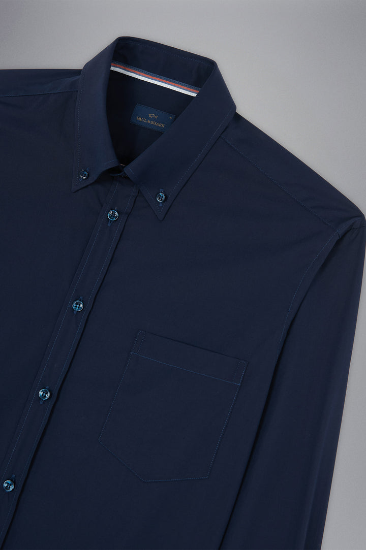 A menswear classic, rewritten with refined materials and sophisticated details. This shirt is crafted from cool, naturally breathable cotton poplin. Its straight cut with rounded hem ensures an elegant fit, elevated with a button-down collar and chest pocket. Embellished with striped pattern on the inside for a signature Paul & Shark touch.