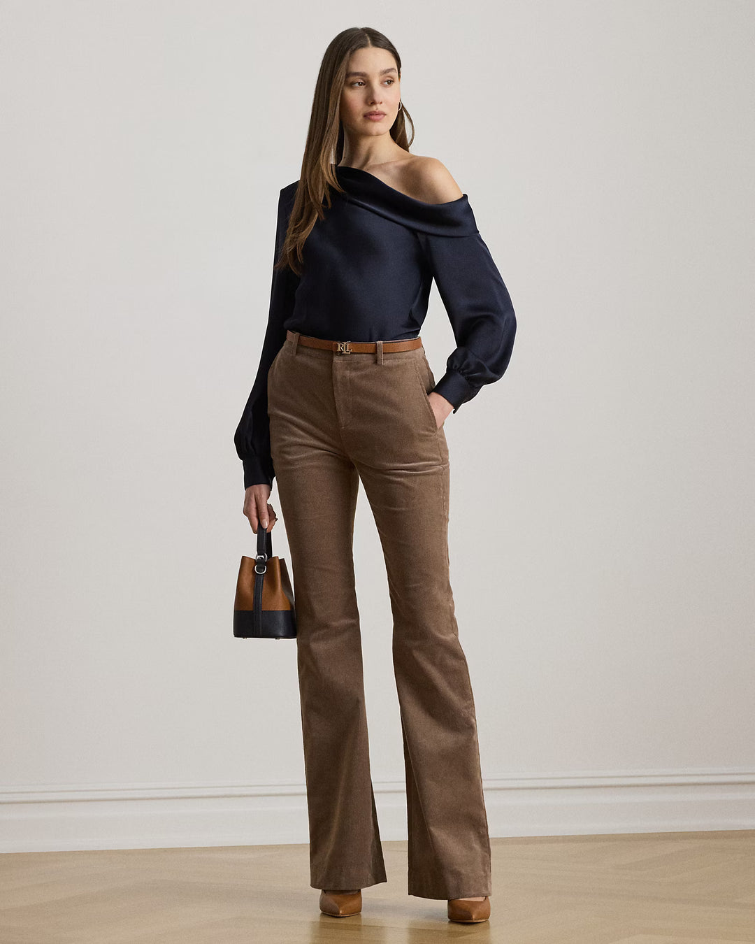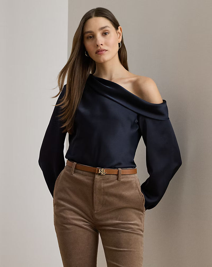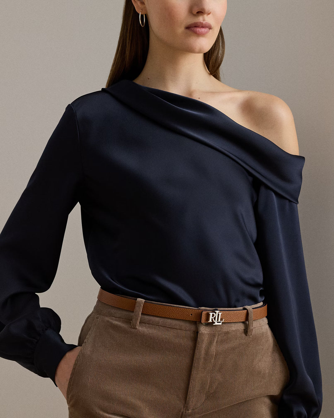 The luxurious texture of satin charmeuse gives a lustrous sheen to this blouse, which is defined by a one-shoulder silhouette and blouson sleeves. "LRL"-engraved buttons afford a signature Lauren Ralph Lauren finish.