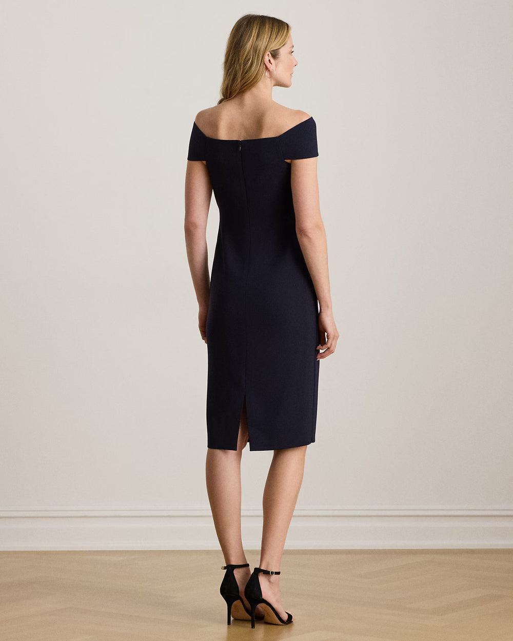 Distinguished by a twist-front off-the-shoulder neckline, this refined cocktail dress features a sheath silhouette crafted from smooth, stretch-infused crepe.