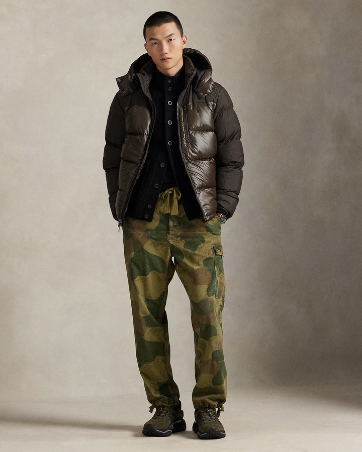Made from water-repellent fabric, this jacket is insulated with 650-fill-power down and constructed with a detachable hood. A tonal combination of matted and glossed panels provides a modern take on texture.