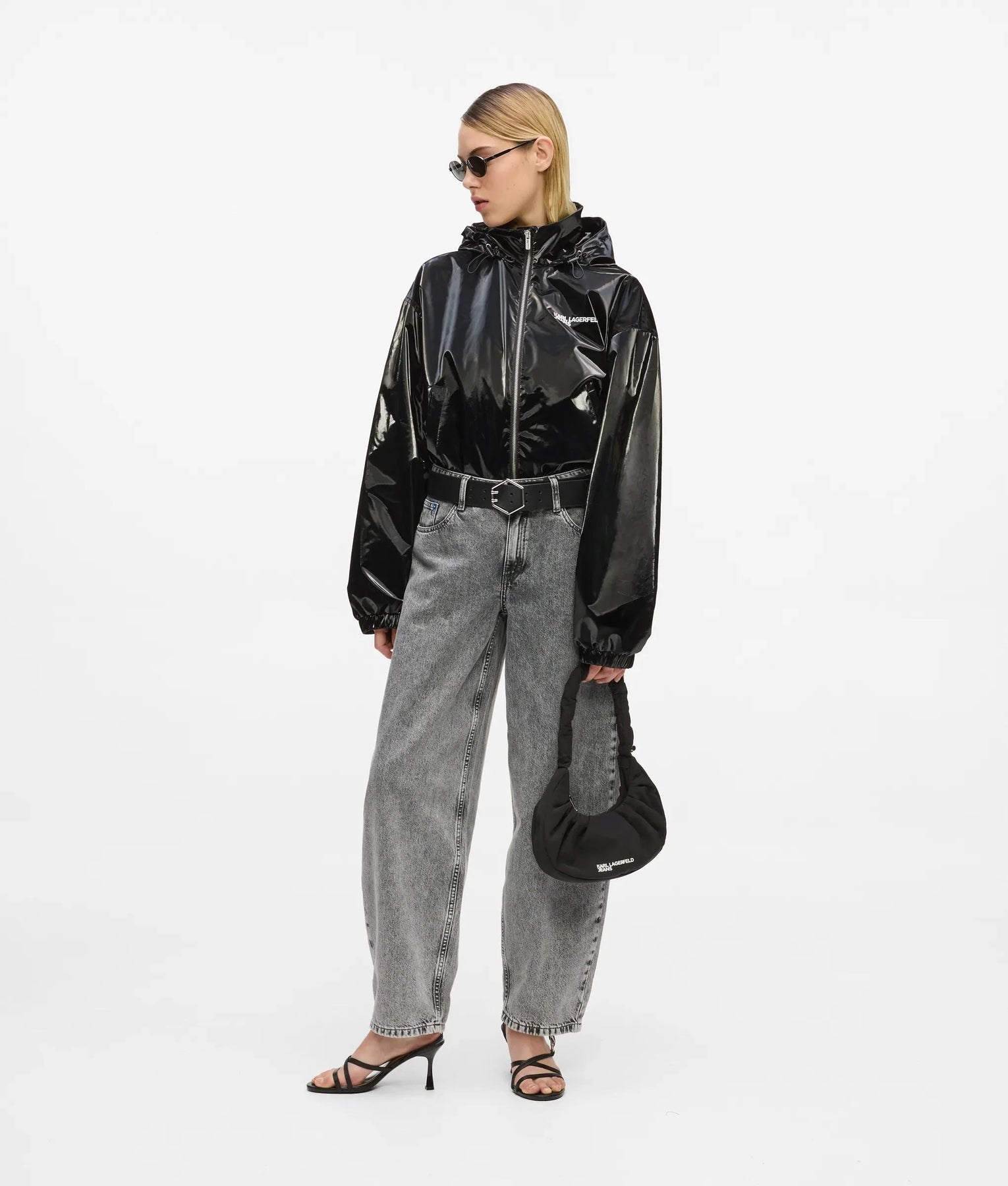 Bold, sleek, and unapologetically KARL LAGERFELD JEANS. Made from a glossy polyester-blend, this zip-up jacket takes a track-inspired silhouette and transforms it with a glossy finish.