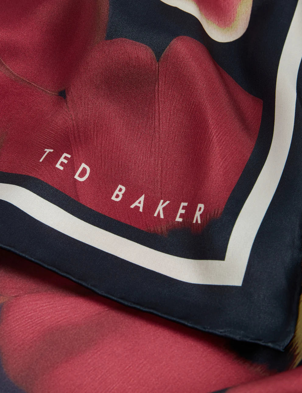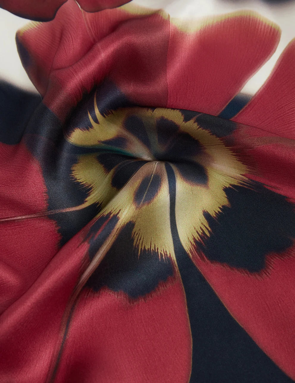 A luxurious silk scarf with a vibrant floral print, perfect for elegant accessorizing.