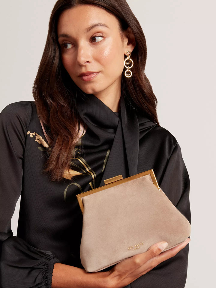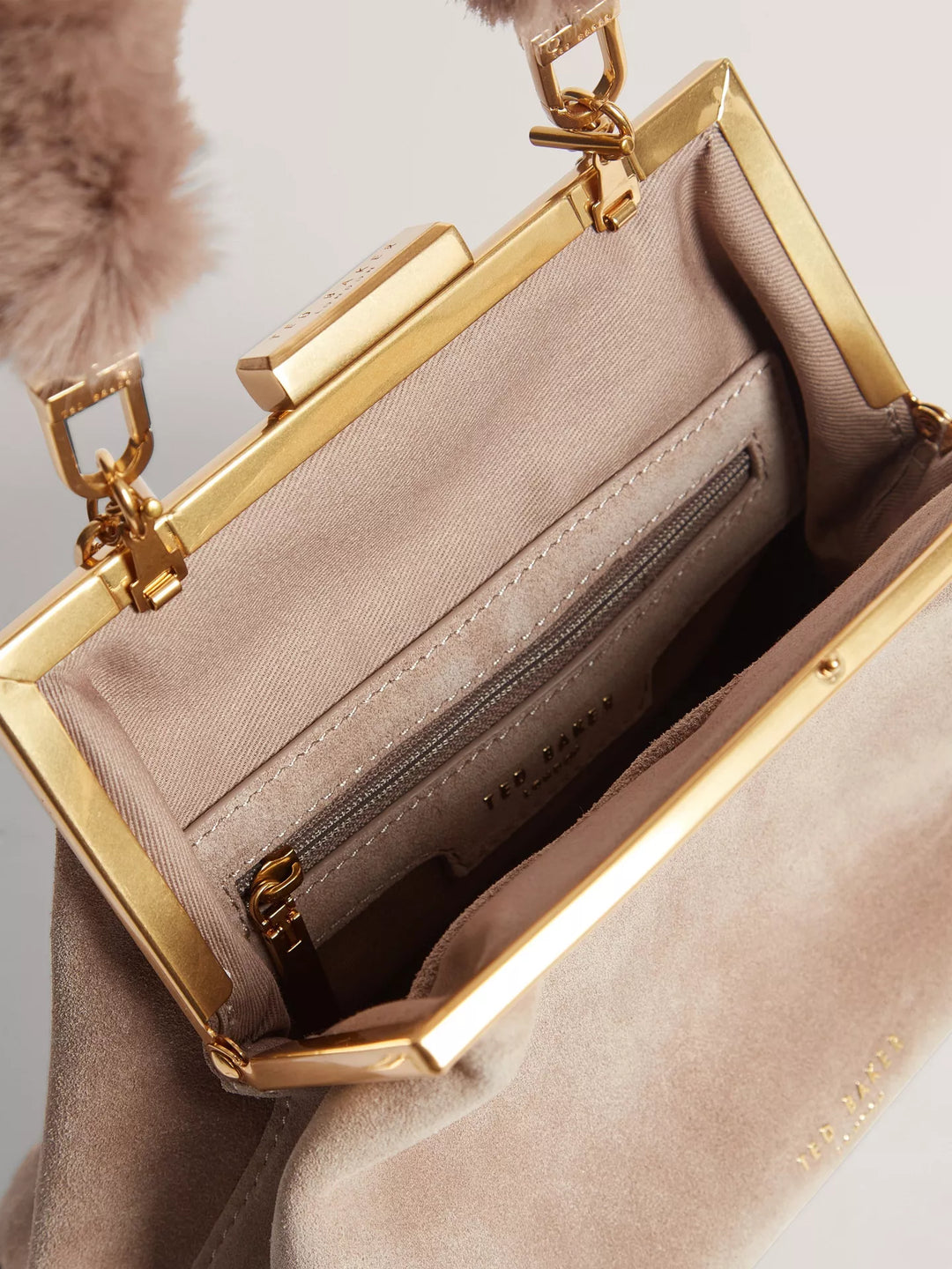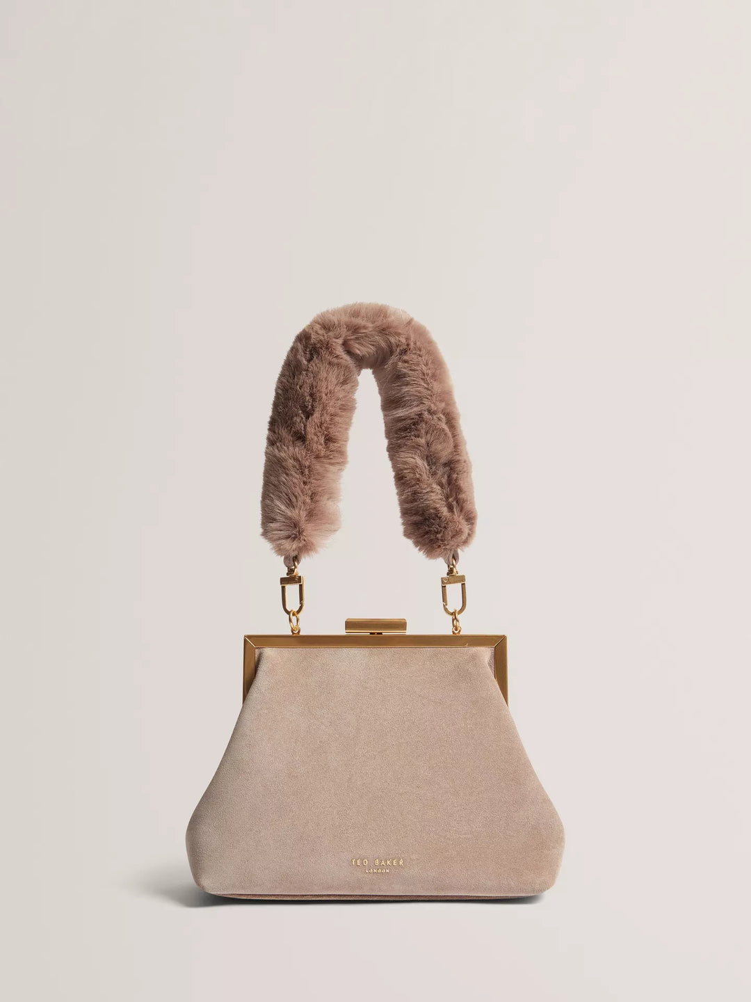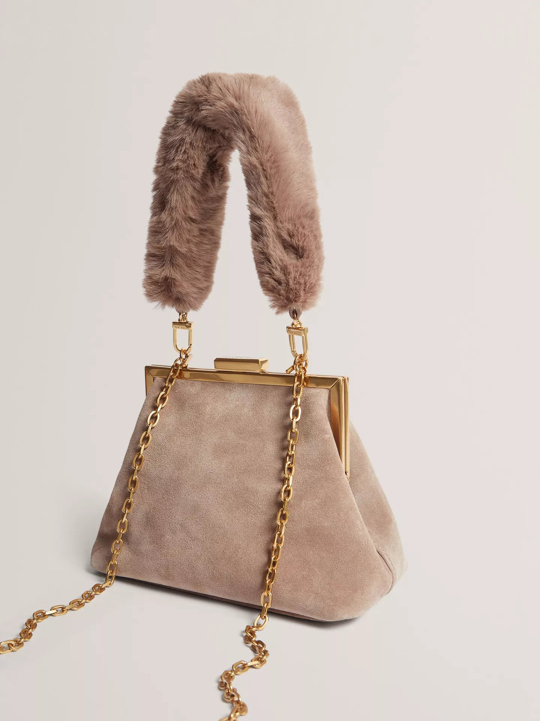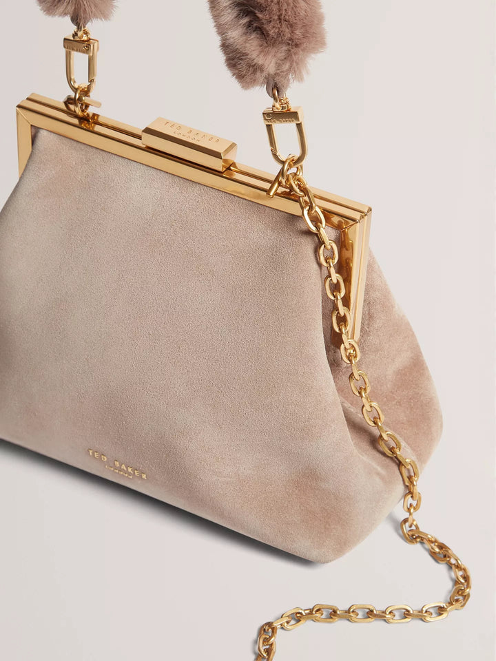 This textured suede clutch adds intrigue to your evening, offering flexible carry options and a secure turn lock fastening. Designed to fit your essentials, it features a plush faux-fur handle and gold-toned chain detail.