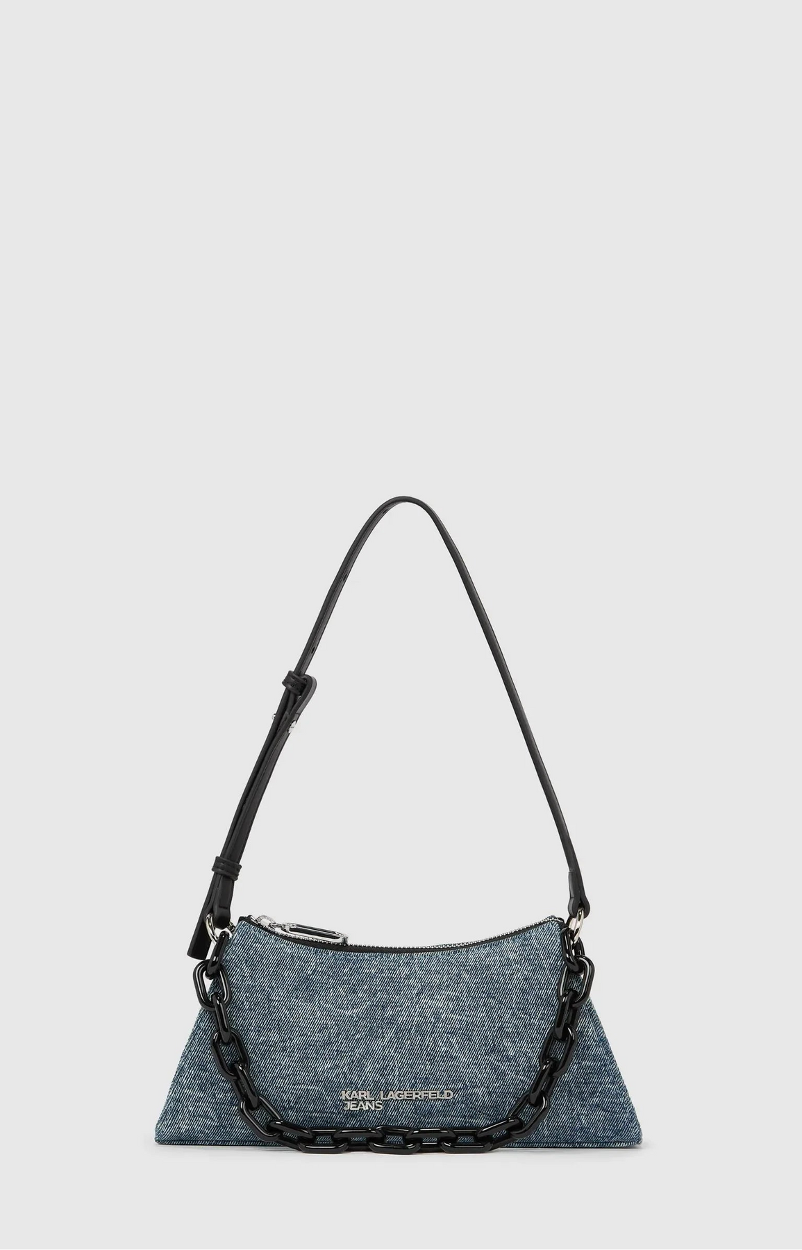 The spirit of rebellion, this bold geometric shoulder bag is crafted from urban washed denim with edgy chain detailing. Featuring a secure zip-top and anchored by KARL LAGERFELD JEANS hardware.
