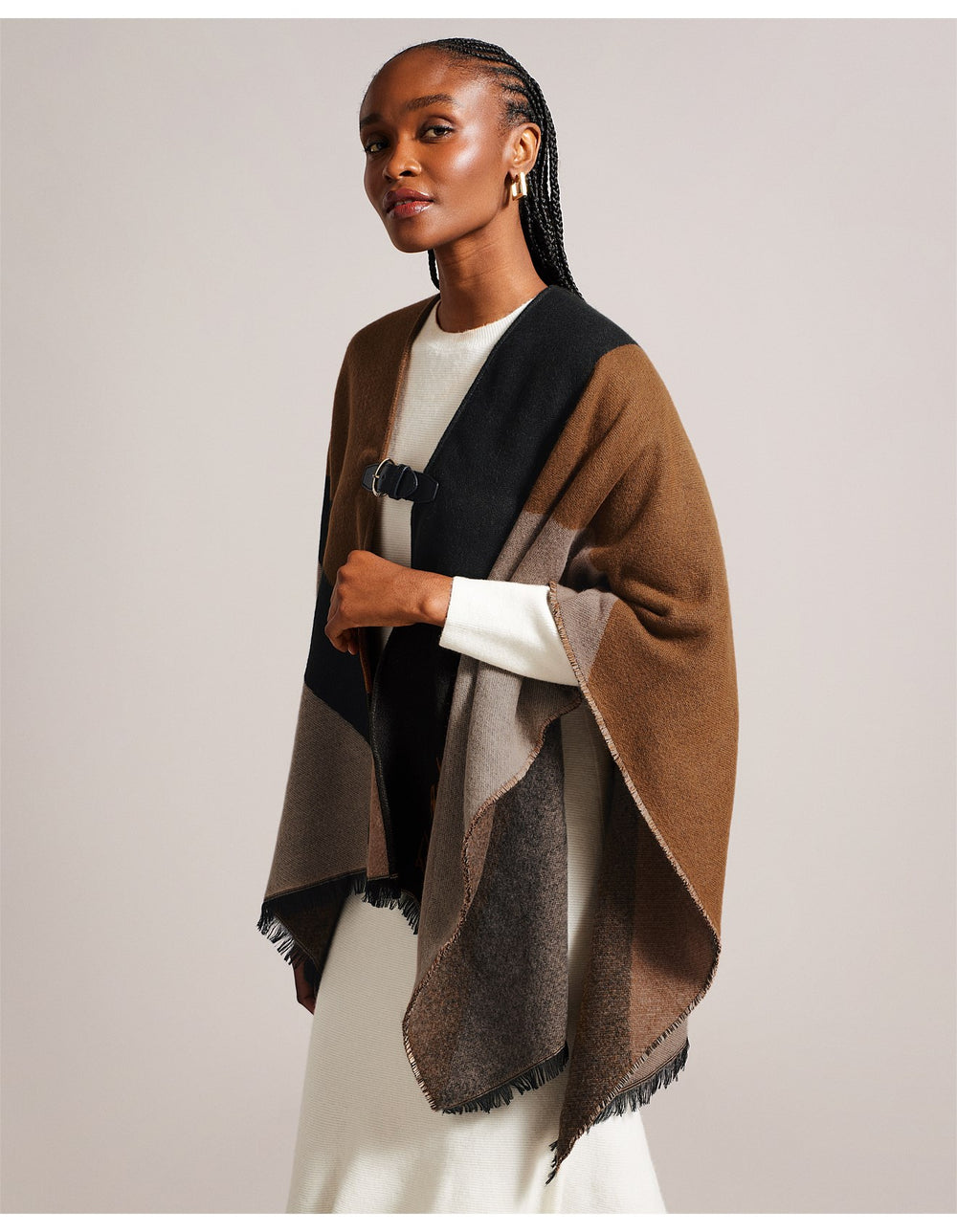 Looking for a stylish way to protect yourself against the elements? Meet SUFFIA. Designed in a colour block pattern with a fringe edge and buckle fastening detail, this poncho is a stylish and cosy addition to any outfit.