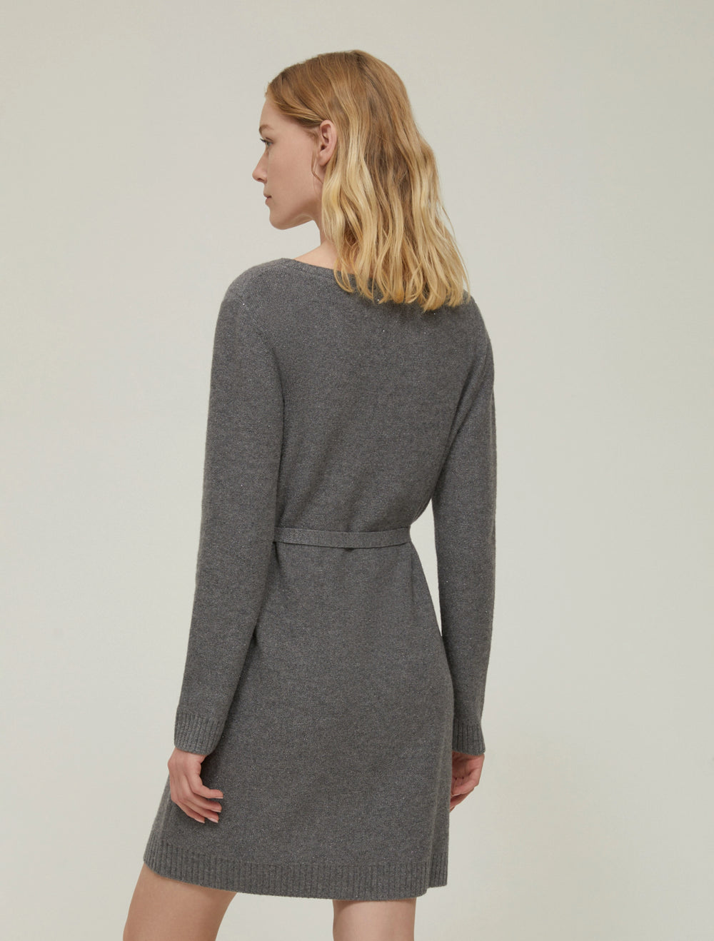To be worn with a clean cut or cinched at the waist with a belt: this maxi jumper dress is knitted inside out to enhance the knitted texture, and illuminated with micro sequins: perfect for winter parties.