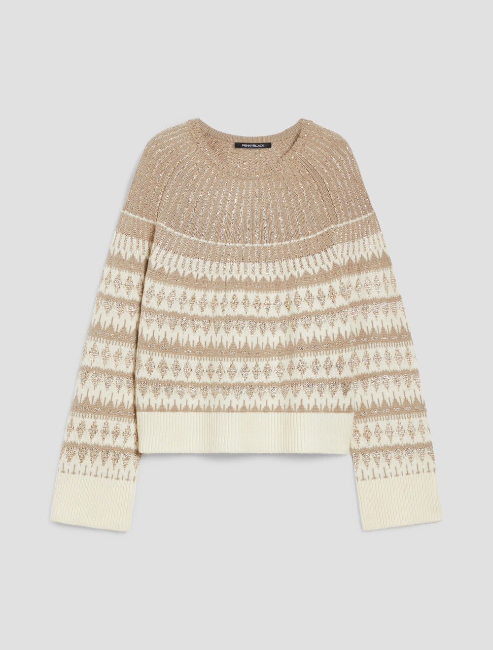 This geometric-patterned jacquard sweater boasts all the charm of Nordic knitwear, plus a little something extra: the sparkling embellishments will light up any look.